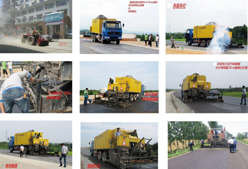 稀漿封層工藝原理是將乳化瀝青、符合級(jí)配的骨料、水、填料及添加劑按一定的設(shè)計(jì)配比攪拌成稀漿混合料,均勻地?cái)備佋诖幚淼穆访嫔?,?jīng)裹復(fù)、破乳、析水、蒸發(fā)和固化等過程與原路面牢固地結(jié)合在一起,形成密實(shí)、堅(jiān)固、耐磨和道路表面封層,大大提高路面使用性能。
