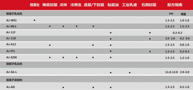 瀝青乳化劑產(chǎn)品使用對照表